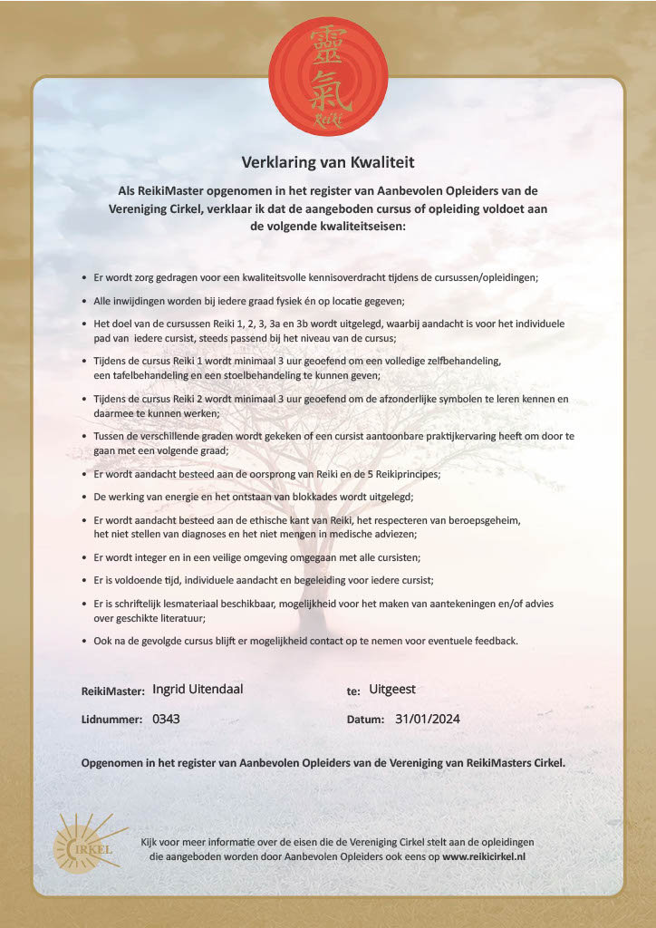 Je word niet opgeleid als Reikimaster-Teatcher (leraar). Je kan dus geen cursussen